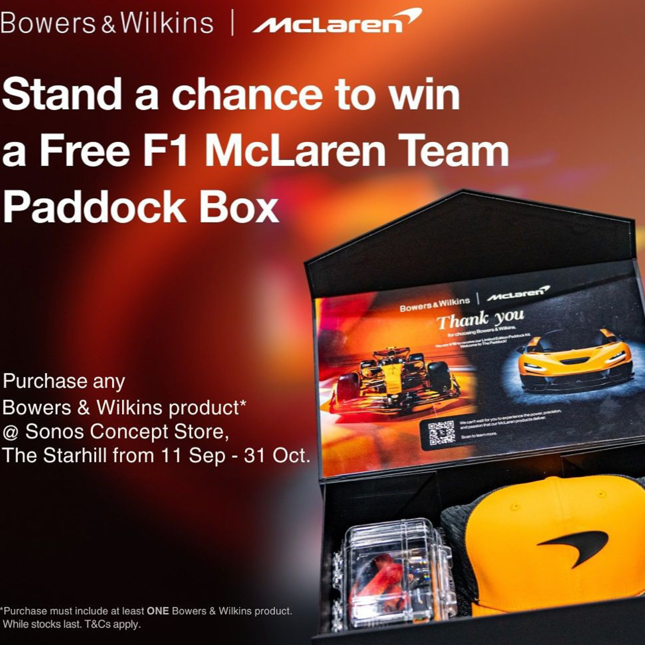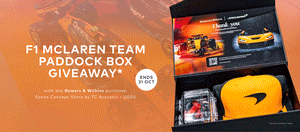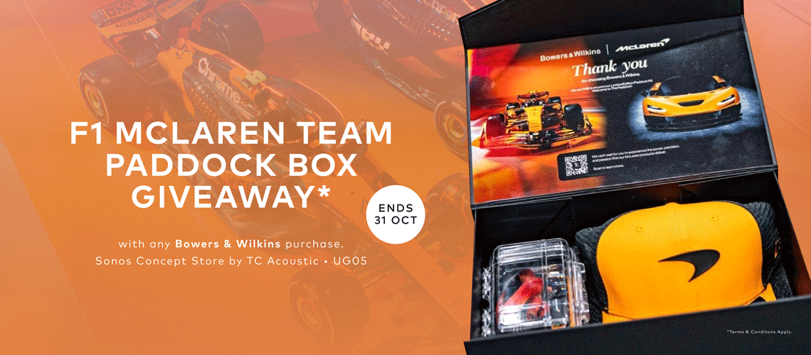 Win the Ultimate F1 McLaren Team Paddock Box! 🏁 Purchase any Bowers & Wilkins product* at the Sonos Concept Store, The Starhill between 11 Sep – 31 Oct and stand a chance to take it home. Luxury sound meets racing passion. Don’t miss it.